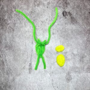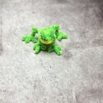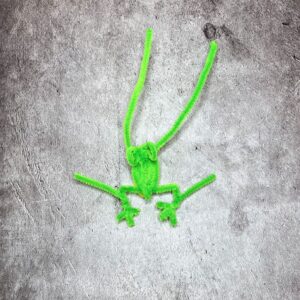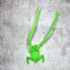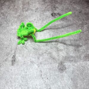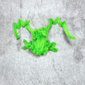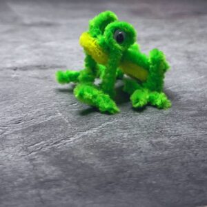 Rolle den langen gelben Pfeifenputzer (30 cm) und den kurzen gelben Pfeifenputzer (15 cm) jeweils komplett zu einer Scheibe auf. Verstecke die Enden.Biege die Scheiben jeweils in eine längliche bis ovale Form. Die große gelbe Scheibe wird nun als Bauchplatte von unten an den Frosch geklebt.Die kleine gelbe Scheibe klebst Du von unten als Unterkiefer an Deinen Frosch. Falte die Hinterbeine zu Froschschenkeln.Biege den überstehenden Draht je Seite zu Schenken. Biege ihn hierzu jeweils in der Mitte. Der Oberschenkel zeigt nach vorn, der Unterschenkel nach hinten. Nun falten wir die Zehen aus den beiden 15 cm langen grünen Pfeifenputzern.Biege jedes Teil etwa 1 cm vom Ende nach unten zu einem Zickzackmuster bis sich je drei 1 cm lange Zehen bilden. Verdrille den Draht jeweils direkt hintern dem Fuß etwa dreimal, um diesen zu fixieren und das kurze Endstück zu verstecken.Verdrille jeden Zeh einmal einzeln. Setzte die Fußteile je Seite so an, dass die Zehen in der richtigen Position am Hinterbein sind.Verdrille die Fußteile mit dem Bein und wickle den restlichen Draht dann je ein bißchen am bein hoch. Verstecke die Enden. Nun formen wir die Vorderbeine unseres Froschs.Biege die vorderen Drähte je unter den Körper und knicke sie nach 3 cm (etwa auf Höhe der Hinterfüße) nach vorn weg. Forme nun je Seite wieder einen Fußteil im Zickzackmuster mit 3 Zehen. Verdrille die Drähte direkt hinter dem Fuß und trimme das Reststück. Verdrille jeden Zeh einmal einzeln.