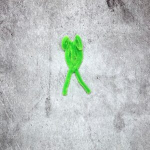 Biege die beide gerade gerollten Kreise nun so, dass sie senkrecht zum Körper des Froschs stehen. Flache die Augenscheiben zu Halbkreisen ab.Fixiere die Augenscheiben, indem Du das Endstück je Seite von oben nach unten durch den Froschkörper führst und versteckst. Nimm einen neuen grünen Pfeifenputzer (30 cm).Führe ihn direkt unterhalb der Augenscheibe von oben nach unten durch den äußeren Ring der linken Öffnung und hole ihn durch den äußeren Ring der rechten Öffnung wieder auf die Oberseite. Drücke alle Drähte des Mittelkörpers nun etwas zusammen, so dass keine Öffnungen mehr sichtbar sind. Drehe den Frosch auf den Rücken und forme eine kleine leicht zu Dir geneigte Schnauze zwischen den Augen.