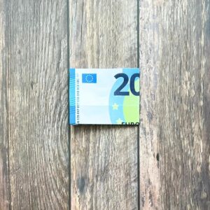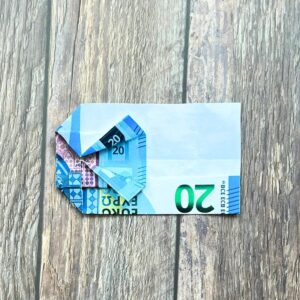 Lege den Geldschein horizontal vor Dich.Falte ihn der Länge nach quer.Klappe die Falz wieder auf. Falte die lange Unterkante des Geldscheins auf die horizontale Mittelfalz.