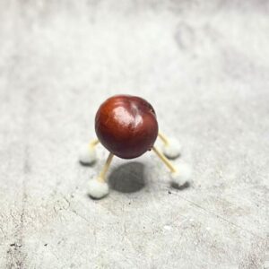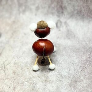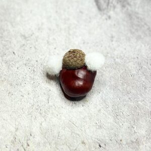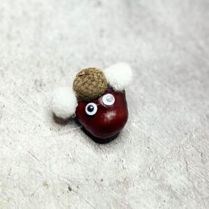 Klebe zwei Erlenkätzchen oder zwei kleine Pompoms für die Ohren an die kleine Kastanie. Klebe eine Eichelkappe obendrauf.